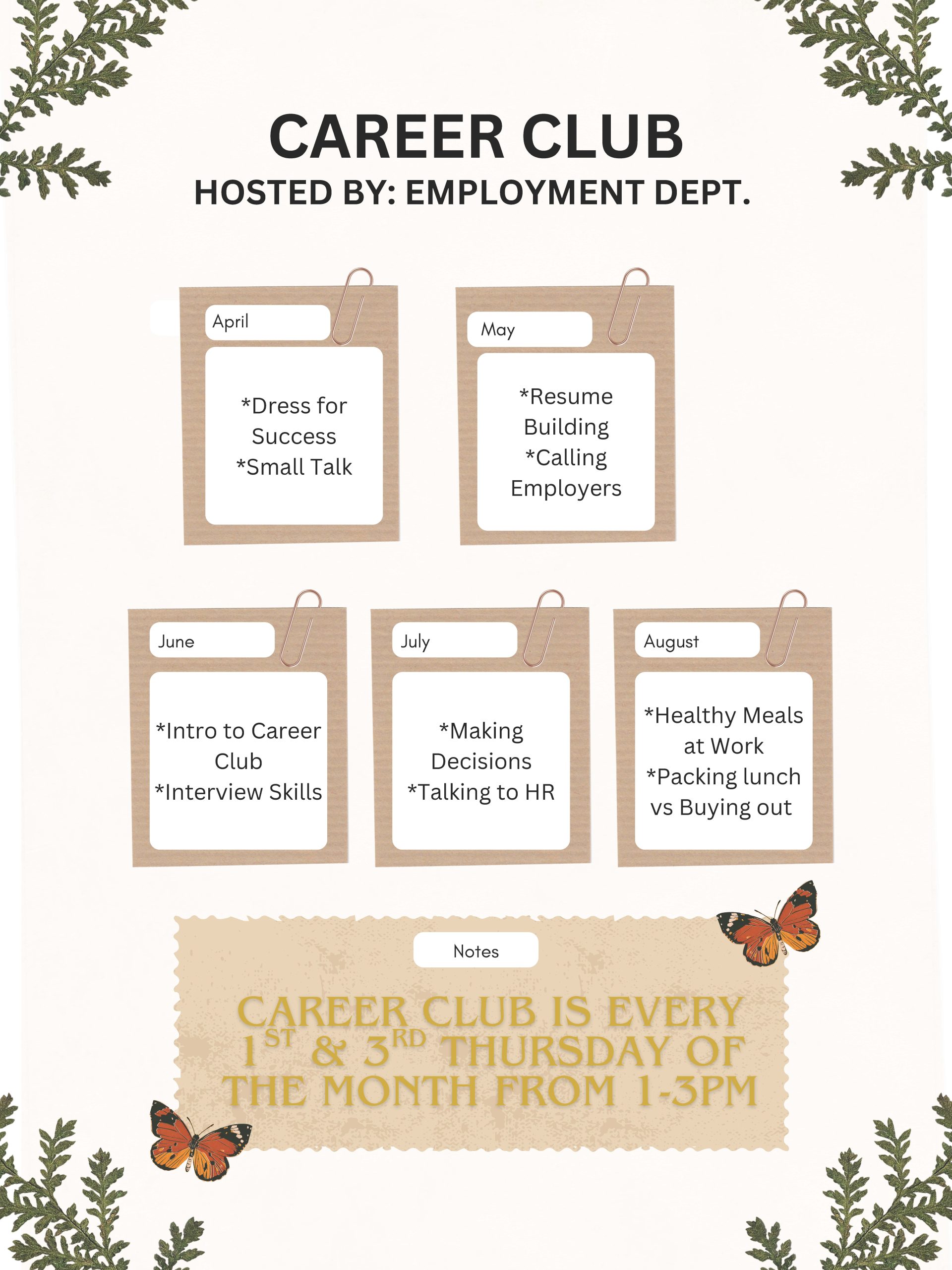 The Career Club will now be hosted twice a month, on the 1st and 3rd Thursday of the month, from 1-3pm. We will continue to host it in the Upstairs Employment Board room (Next to the ERSP team). We have also created focused topics for each session. We will also have a virtual option for those that cannot make it to our Mission Hills office. Please keep in mind that Career Club is for our internally supported individuals; our goal is to empower them to be employment ready while continuing to provide individual support as needed.