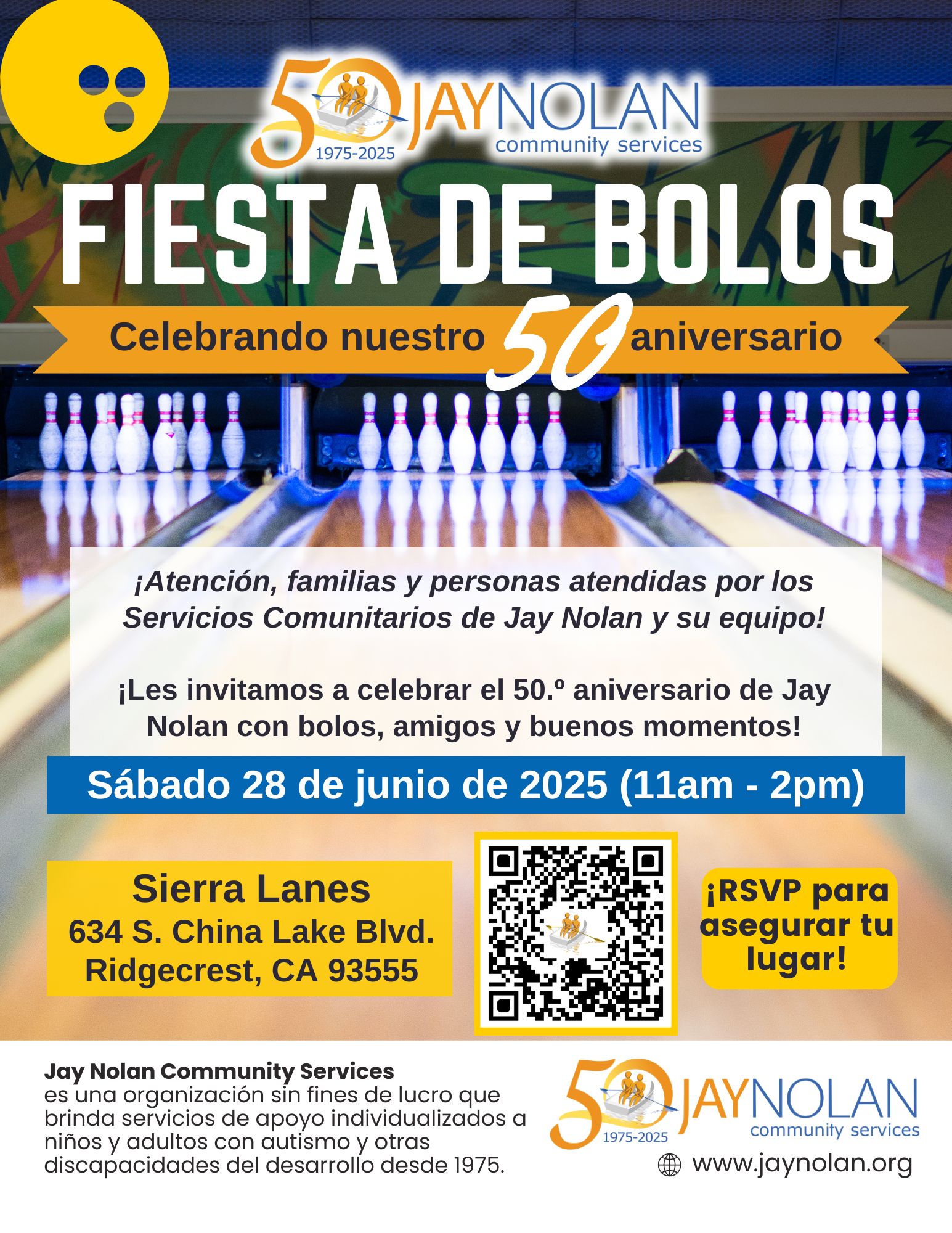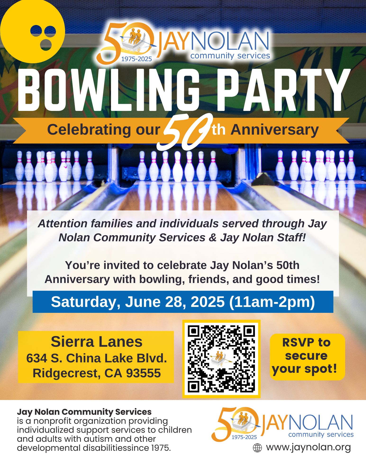 Attention families and individuals served through Jay Nolan Community Services & Jay Nolan Staff: You’re invited to celebrate Jay Nolan’s 50th Anniversary with bowling, friends, and good times! ***SPACES ARE LIMITED: RSVP