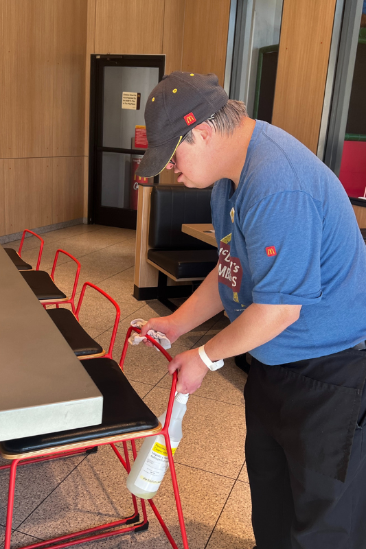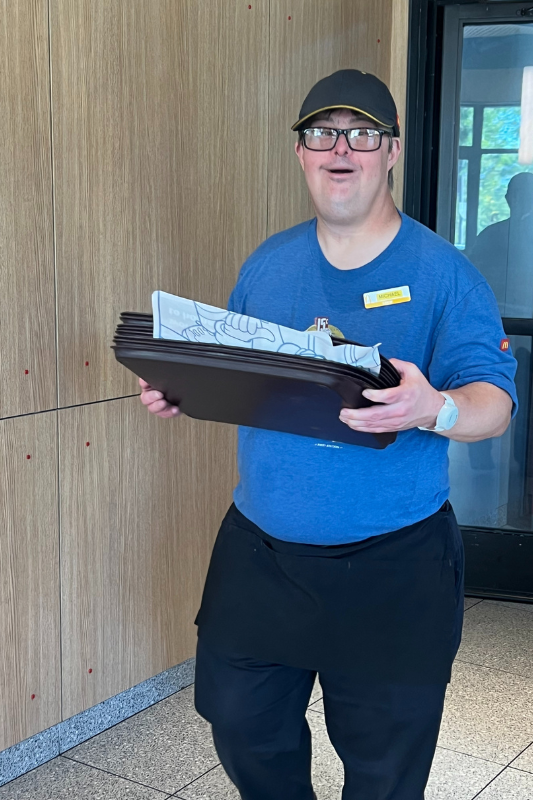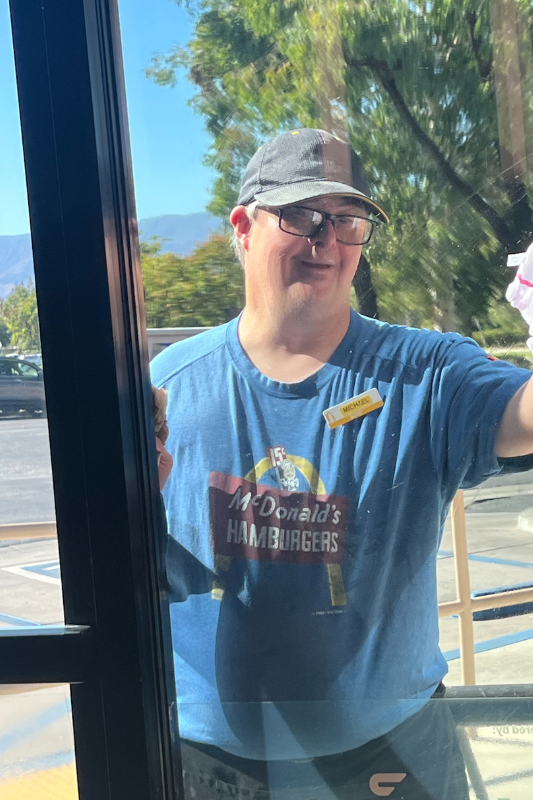 After completing his education in 2000, Michael immediately transitioned into the workforce and has been working for McDonald’s ever since. 24 years later and Michael is still an exemplary employee with a love for his work. His schedule consists of cleaning tables, chairs, kiosks, windows, and the drink bar, along with packaging Happy Meal boxes. He is known for working diligently and always with a smile on his face.