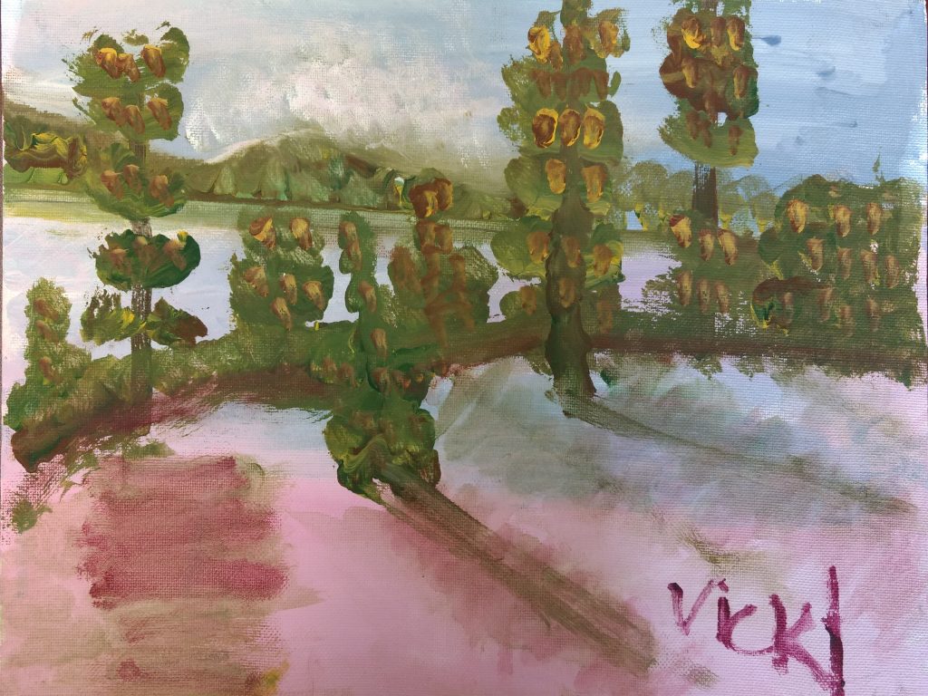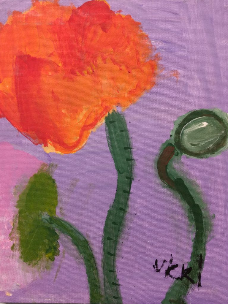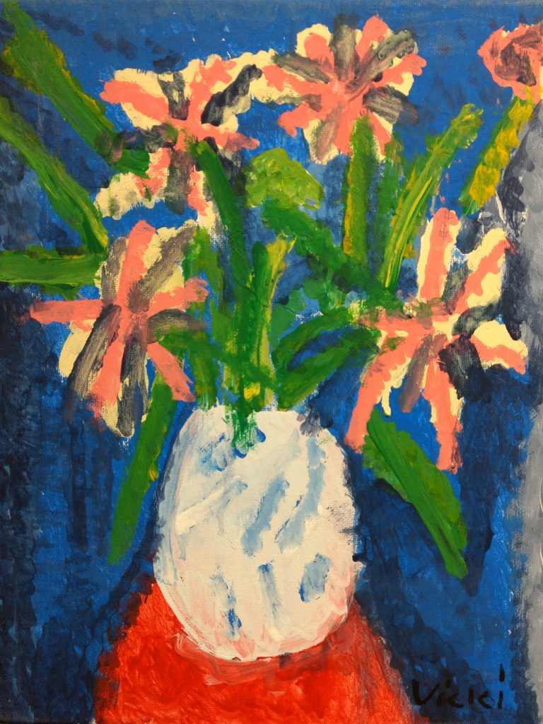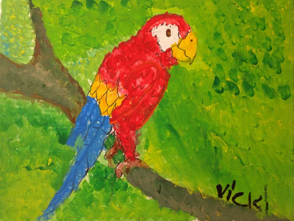 Vicki’s most striking accomplishment in the past few years has been immersing herself in painting. She consistently attends art classes three day a week and has developed an incredible talent for painting using acrylics. Her art is extremely imaginative and show a great deal of control and artistic vision. She has an incredible range of painting styles: her works range from chaotically colorful abstractions to more subdued yet expressive realistic portrayals of the natural world. The subject matter varies from flowers to animals to cityscapes yet every painting has a sense of personality and individuality. Painting, it seems, has given Vicki a chance to express her inner voice like never before.